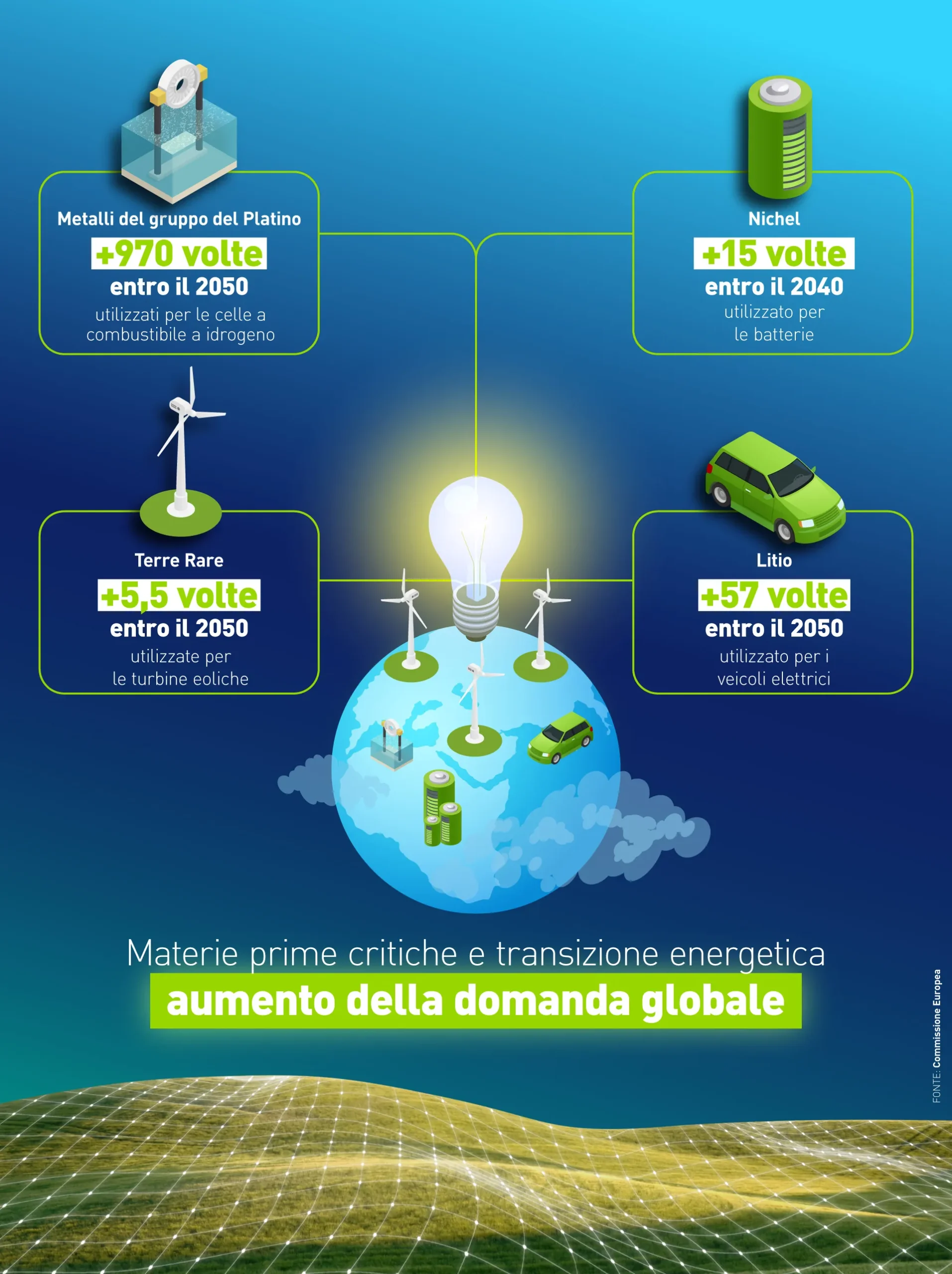 La loro importanza è destinata a crescere in modo esponenziale. Secondo le analisi condotte dalla Commissione Europea, la domanda globale di litio potrebbe aumentare fino a 57 volte entro il 2050, mentre quella dei metalli del gruppo del platino potrebbe moltiplicarsi addirittura di 970 volte. Numeri che raccontano una trasformazione strutturale dell’economia globale e che rendono evidente come queste risorse siano ormai leve strategiche per la competitività e la sicurezza dei sistemi industriali.